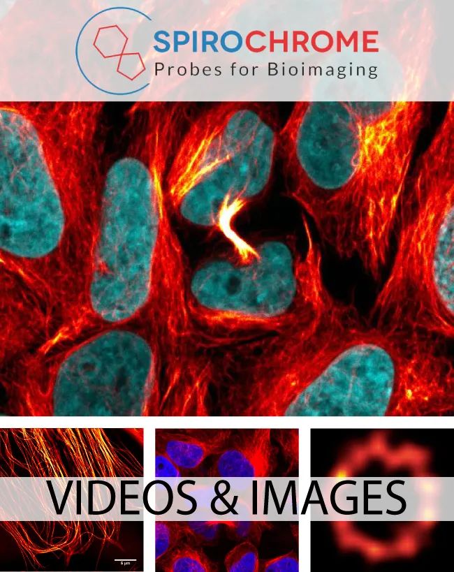 Spirochrome 开发的 SiR-、SPY-、PK- 和 Flipper-TR 活细胞成像探针是细胞渗透性化合物,可标记活细胞中的微管、F-肌动蛋白、溶酶体、膜、线粒体和染色体 DNA。SPY? 探针改进了 SiR 活细胞成像技术,同时还扩展了荧光团标记选项,用于研究活细胞中的 F-肌动蛋白、微管和 DNA。